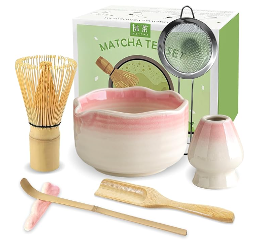 • High-quality Japanese matcha set – 1 x ceramic matcha bowl with spout (500 ml), 1 x bamboo matcha whisk, 1 x ceramic stand for matcha broom, 1 x matcha strainer, 1 x teaspoon holder and 2 x teaspoons (1 teaspoon and 1 matcha spoon). For a delicious tea drinking experience.